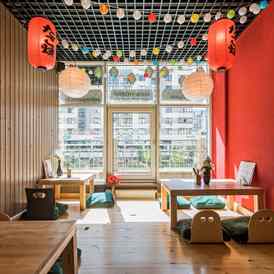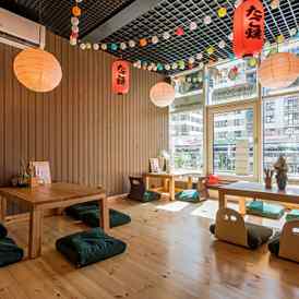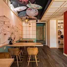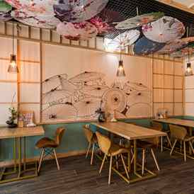 Зал заведения условно делится на две зоны: одна напоминает фестивальную с фонариками, зонтиками и панелями, а вторая — более традиционная японская зона с низкими столиками, где сидеть нужно на напольных подушках.